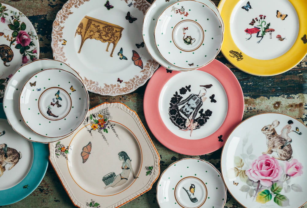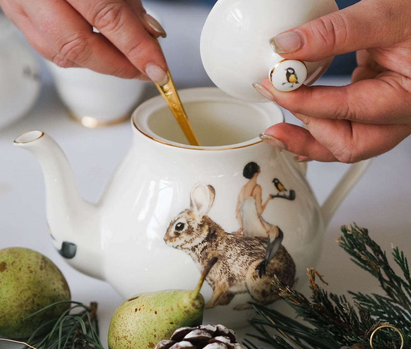 Artist, Ali Miller, creates beautiful fine bone china tea sets and textiles. Each piece is crafted from the finest materials, designed and decorated by hand in the UK. Her designs tell playful stories full of whimsy and humor, taking inspiration from childhood memories, nature and British eccentricities.